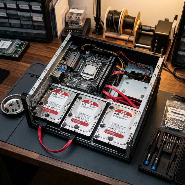 - Schritt 2: Festplatten einbauen und SATA-Kabel anschließen. Bei mehr als 4 Platten brauchst du ggf. einen HBA-Controller (z. B. LSI 9211-8i).